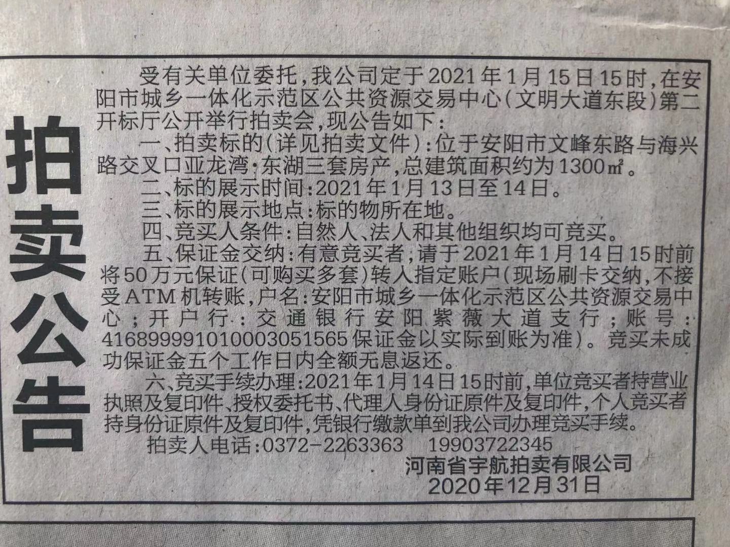 一、拍卖标的(详见拍卖文件):位于安阳市文峰东路与海兴路交叉口亚龙湾•东湖三套房产,总建筑面积约为1300㎡。